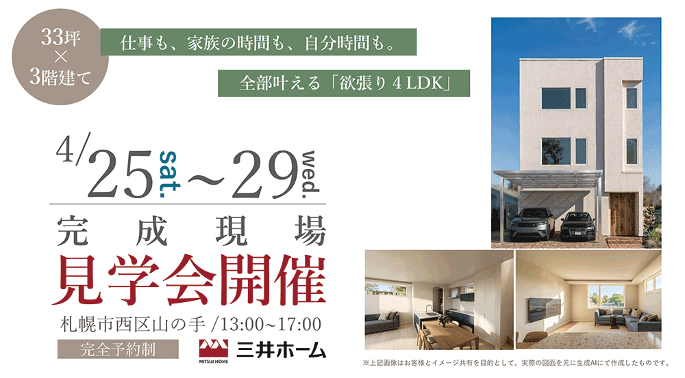 限られた敷地面積を最大限に活かし、縦の空間を自在に操る三井ホームの設計力。 33坪という都市型の敷地条件ながら、4LDKに広々とした書斎、そして圧倒的な開放感をすべて叶えた「欲張りな住まい」が完成しました。